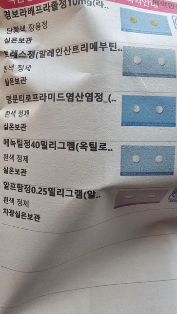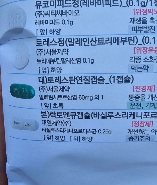 - 약 복용약·영양제Q. 과민성대장증후군 복통에 어떤약이 더 좋을까요?작년에 과민성 대장 증후군 설사로 인해 한달정도 약 복용했었는데이번에 과음 후 배가 사르르 한 복통이 있어서 보니까 과민성 대장 증후군이 다시 도진거 같은데요설사는 없고 정상대변. 사르르한 복통만있는데두가지 처방약 중에 어느 약이 더 효과가 좋고 쎌까요?1.2.메녹틸정40밀리그램명문티로프라미드염산염정라파부틴정100밀리그램경보라베프라졸정10밀리그램알프람정0.25밀리그램