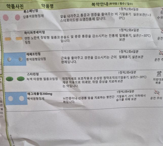 - 약 복용약·영양제Q. 약 복용에 대해서 궁금합니다....제가 일주일전부터 오른쪽 얼굴이 턱에서 볼부위가 왔다갔다 좀 묵직하게 아프고 불편한게 반복이 되서 병원을 갔습니다. 병원에서는 제가 거북목에다가 목디스크가 있다고 하셨고 삼차신경통일수도 있다고 하시면서 주사처방 받고 먹는약도 처방 받았습니다. 그날 저녁에 약먹을때는 괜찮았는데 오늘 아침에 약을 먹었는데 졸린건 물론이고 너무 어지럽고 토할거같습니다..이게 약때문이 맞는걸까요...아침약인데 아직까지도 어지럽고 속이 안좋은데 어떻게 해야될까요...