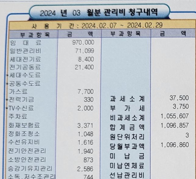 - 부동산경제Q. 관리비 명세서 이해가안됩니다 도와주세요ㅠ지난달 2/07부터 이사했었는데지난달에 관리비 명세서가와서 냈었는데이번달 관리비 명세서가 나와서 보는데 이해가안됩니다왜 이번달 청구내역 사용기간이 0207~0229인가요?그러면 지난달에 낸 임대료는 뭔가요?위에께 이번달 밑에가 지난달 명세서입니다