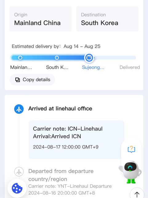 - 생활꿀팁생활Q. 중국택배(알리) 언제쯤 도착예정일까요..24일 토요일까지 배송될 가능성 얼마나 있을까요! 이틀 전에 인천공항 도착했습니다. ㅠㅠ 도착할 확률 어느정도인지 궁금합니다