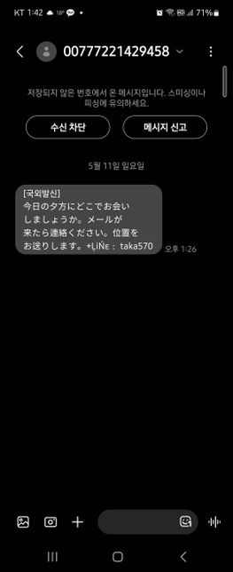 - 기타 법률상담법률Q. 007로시작하는 일본어로온 메세지가 오는데 이게 뭔가요?평점하게 있었는데 갑자기 일본어로 메세지가 날라왔습니더. 007로 시적하는 매세지인데 내용은 오늘저녁에 어디서 만날지 물어보고 알려준다면서 라인으로 유도하더라구요 이거 성매매등등의 범죄에석하는걸까요? 메세지를 신고해두긴했는데.....
