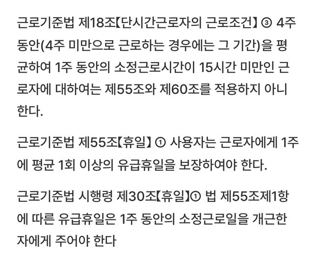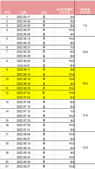 - 임금·급여고용·노동Q. 주15시간 이상 미만을 반복할때 주휴수당을 지급해야 하나요?계약서 상은 주2일 7시간씩 14시간 초단시간 근로자인데 예약을 받아 진행되는 사업장이라 현장 상황에 따라 주1일 혹은 3일 근무한적도 있으며, 주15시간 이상 미만을 반복하여 근무하였습니다. 1년정도 근무하였으며 누락된 부분을 소급하여 지급하고자 합니다.15시간이 넘은 모든 주에 대해 주휴수당을 지급해야하는지요? 아니면 , 아래에 해당하여 4주 평균을 내어 15시간이 넘는 4주에 대하여만 주휴수당을 지급해도 될까요? (아래 주차별로 기록한 근무시간 노란색 부분만 해당하는 주에 지급하면 될지 확인 부탁드립니다)