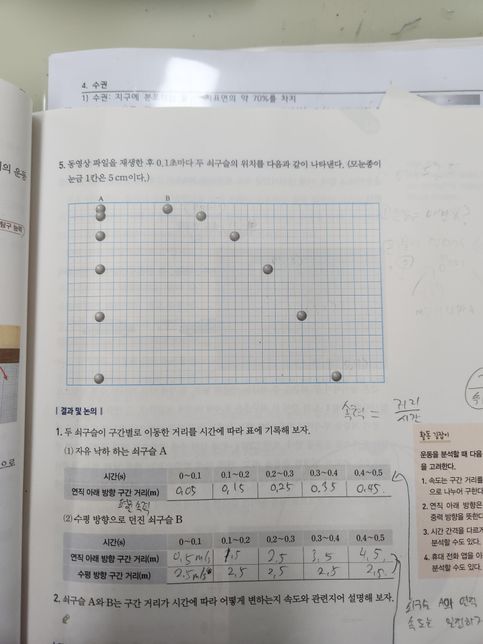 - 물리학문Q. 등가속도 관련해서 궁금한게 있습니다. 고 1입니다.밑의 사진에서 쇠구슬 a가 등가속도임에도 불구하고 0~0.1구간에선 왜 0.05m이고 다음 구간부턴 왜 0.1씩 증가하냐고 물었더니 쌤이 그래프를 그리면서 설명해주셨는데 그 그래프가 어떤 모양이었는지 기억이 안 나서요.설명해주실 수 있나요??