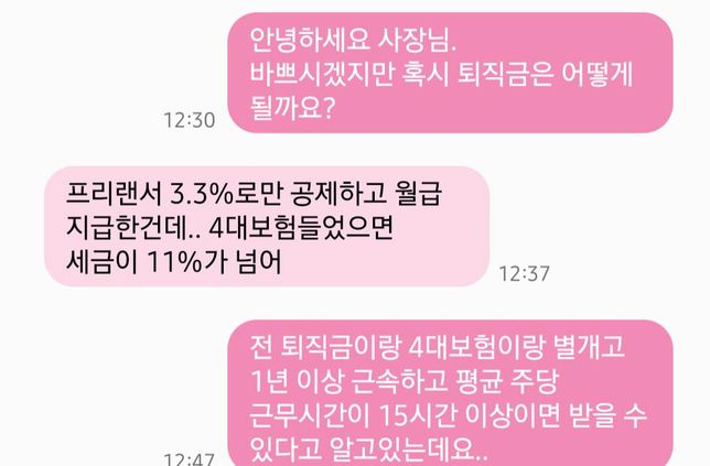 - 임금·급여고용·노동Q. 알바 퇴직금 관련해서 사장님께 문자했는데 어떻게 해야할까요?원만한 합의를 보고 싶은데 읽으시고 답변이 안 오네요... 계속 답이 안 올 시에는 뭐라고 보내면 좋을지 좀 부탁드려요ㅜㅜ....!