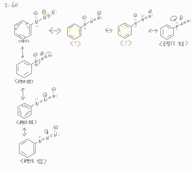 - 화학학문Q. 유기화학 공명구조 그림이 안되는 것 질문문제에서 "Azidobenzene의 공명구조 중 하나인 기본구조가 있고 여기에 공명구조 3개가 있다. 3가지 공명구조를 그려라"라고 나와있는데요.그림은 기본구조를 중심으로 아래쪽 방향이 답지에서 나온 3가지 공명구조고, 오른쪽 방향이 제가 그린 3가지 공명구조입니다. 제가 그린 3가지 공명구조중 가장 오른쪽 그림만 답지에 맞고 빨간색으로 라고 써져 있는 그림 2개는 틀렸더라구요. 답지에서 나온 3가지 공명구조는 모두 이해되고 납득은 가지만, 제가 빨간색으로 라고 쓴 2개의 그림구조는 왜 틀렸는지 이해가 잘 안가요... 저 2개의 그림구조가 왜 틀렸는지 설명해주세요Ps : 그림에 나와있는 보라색 화살표는 답지에서 나온 전자 이동 메커니즘 표시고, 노란색 화살표는 제가 혼자 추측하며 그린 전자 이동 메커니즘이니 보라색 화살표와 노란색 화살표는 별개입니다