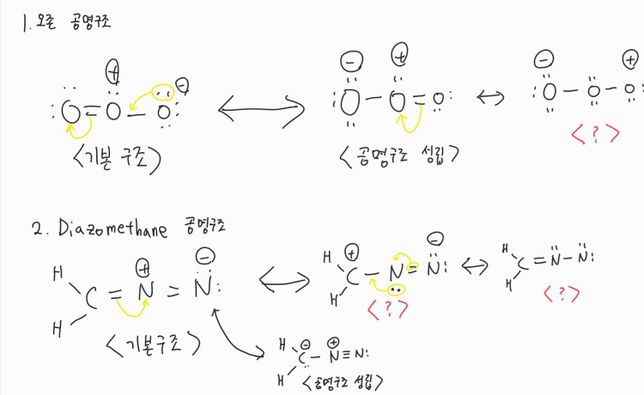 - 화학학문Q. 유기화학 공명구조 그림이 안되는 것 질문아래 사진처럼 해당 화합물의 모든 공명구조를 그리라는 문제를 풀었는데요. 그림밑에 이라고 써져있는 그림은 답지에 나와있는 모든 공명구조고 빨간 글씨로 라고 써져있는 그림은 제가 생각해서 그린 구조지만 답이 틀린,즉 공명이 될 수 없는 구조인데요. 질문1빨간 글씨로 되어있는 총 3개의 그림(1번에 1개,2번에 2개)이 각각 공명구조가 안되는 이유가 궁금합니다.질문2예를들어 기본구조에 +전하를 띠는 원자가 1개, -전하를 띠는 원자가 1개 있다면 공명구조도 무조건 +전하를 띠는 원자가 1개, -전하를 띠는 원자가 1개가 있어야 하는건가요??
