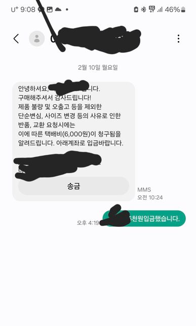 - 생활꿀팁생활Q. 단숨변심으로 교환이 없어서 다른 상품이 옴으로 교환 요청 했을 때 왕복택배비 6천원이 맞는건가요?제가 선 결제할때 배송비 3천원 지불했고 사이즈가 안 맞아서 단숨변심으로 교환하려고 했더니 교환요청이 없어서 다른 상품이 배송됨으로 교환요청을 했습니다. 근데 그쪽 판매자쪽에서 문자 왕복 택배비 6천원 계좌이체 해달라고하네요..전화 통화로 회수할때 3000원 또 배송비 3000원 이라고 하더라고요..근데 보통 단순 변심으로 반품하면 제가 결제한에서 배송비 뺀 구매금액만 돌려 받잖아요?그러면 제 입장에서는 판매자에게 9천원 지불하는게 아닌가요?? 차라리 반품해서 배송뺀 금액만 받고 다시 구매하면 3000원 이라서 6천원인데..