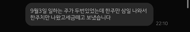 - 임금·급여고용·노동Q. 알바를 제가 이제 3개월 정도 했는데요..안녕하세요 제가 편의점 알바를 지금까지 3개월정도 했습니다 근데 제가 8월 17일부터 9월 15일까지는 주말알바만 했고 그 뒤로는 계속 토,일,월 이렇게 3일을 나가는데 저번 9월달은 제가 23일 월요일그때만 나가고 30일은 사정이 있어 못나갔어요 근데 이번에 월급을 주실때 사장님께서 일하는 주가 두번 있었는데 한주만 삼일을 나와서 한주치만 세금을 떼고 보내셨다고 하시는데 제가 그주 월요일에 안나갓다고 해서 주말에 일한거까지 돈을 안주시는건 아니죠..? 저번에 사장님께서 제가 이제부터 3일을 나와서 일을하니까 주휴포함 및 세금을 떼신다고 했는데 제가 주말엔 나가서 일은 다햇는데 만약 월요일에 못나간다고 해서 그주 주말에 일한걸 안주시는건 아닌지 걱정이 됩니다.. 그냥 빠진날만 체크하시고 일한날만 계산하셔서 월급을 주시는게 맞겠죠..?