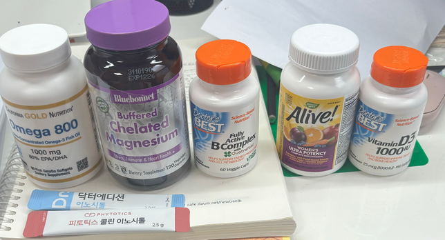 이렇게 먹고잇는데 얼라이브 종합비타민에 비타민 b랑 d 마그네슘 비타민c추가로 먹고잇고 이노시톨에도 콜린이랑 엽산이 함유되어잇어서 과다복용인지 여쭤봅니다 수험생이라 활동량도적고 집에만 계속잇어서 자외선을.거의못봐서 불면증때매 마그네슘이랑 비타민d는 필수로먹 고잇어요