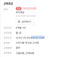 - 임금·급여고용·노동Q. 독서실 총무 급여 관련 확인 부탁드립니다.위와 같이 하루 6시간 독서실에 있으면서 중간 중간 고객 응대하고 청소하는 일이라고 합니다.응대/청소 시간을 하루 1.5시간으로 잡았지만6시간을 독서실 내에서 대기해야 합니다.아이는 어차피 공부해야 하는거니 괜찮다고 하는데저렇게 계산하는 것이 맞는지 궁금합니다.