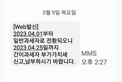 - 종합소득세세금·세무Q. 간이과세자에서 일반과세자로 전환시 해야할 업무에 대한 문오늘 신고했더니 아래와 같이 문자가 왔어요.2023.4.1부터 전환되는건 잘된거같은데요2023.4.25까지 뭘신고하라고 나와서요;;;;어떻게 하면되는지 자세히 알려주세요참고로 2023.1 간이과세자로 사업자 내서 아직 소득이 발생하지 않은 상태입니다.제가 2023.4.25까 뭘하면되나요?