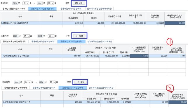 - 부가가치세세금·세무Q. 공통매입세액의 정산내역 5% 미만 문의드립니다.예정때 면세 비율이 5%가 살짝 넘어서 안분계산하여 불공제매입세액이 발생하였는데,확정때는 비율이 5%가 안됩니다. 이때, ②번처럼 예정때 불공제매입세액의 전체를 환급 받아도 되는건가요?아니면 ①번처럼 계산된대로 일부만 환급되는게 맞는건가요?