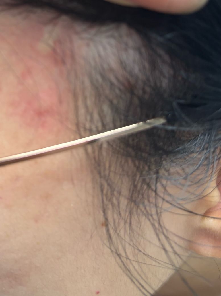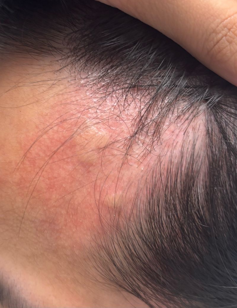 사진상 병변은 경계가 뚜렷하지 않은 홍반 위에 미세한 인설과 긁은 흔적이 동반되어 있고, 양측 헤어라인을 따라 분포하는 양상입니다. 전형적인 단일 곤충교상(모기)처럼 중심부 팽진이 뚜렷한 형태는 아니며, 반복적 가려움과 긁음 이후 악화되는 점을 고려하면 두드러기보다는 접촉성 피부염 또는 지루피부염 양상이 더 의심됩니다. 다만 팔다리까지 가려움이 있었다는 점은 일시적인 알레르기 반응 가능성도 완전히 배제되지는 않습니다.