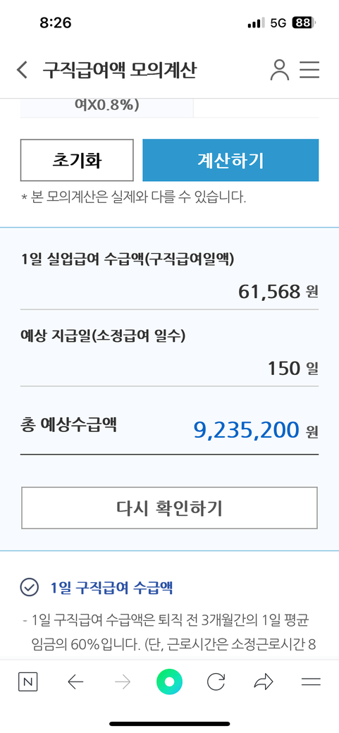 이번 달 말에 권고사직 예정이고요 11~12월은 3일 8시간 근무 하였고 이번 달은 5일 8시간 근무 중입니다 실업급여 모의계산에선 이렇게 뜨는데 이게 맞는 걸까요?