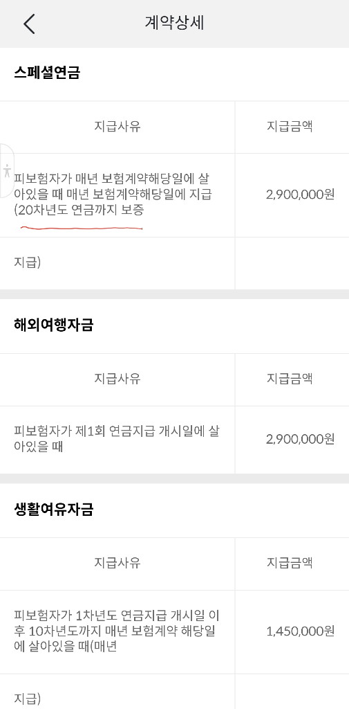 안녕하세요. 해당상품은 종신보험이 아닌 '종신형 연금'인듯 합니다. 말 그대로 사망시까지 약정한 금액을 연금으로 지급한다는 의미이며, 20차년도 보증지급의 의미는 20년까지는 생사여부 상관없이 지급하는 것을 말합니다.