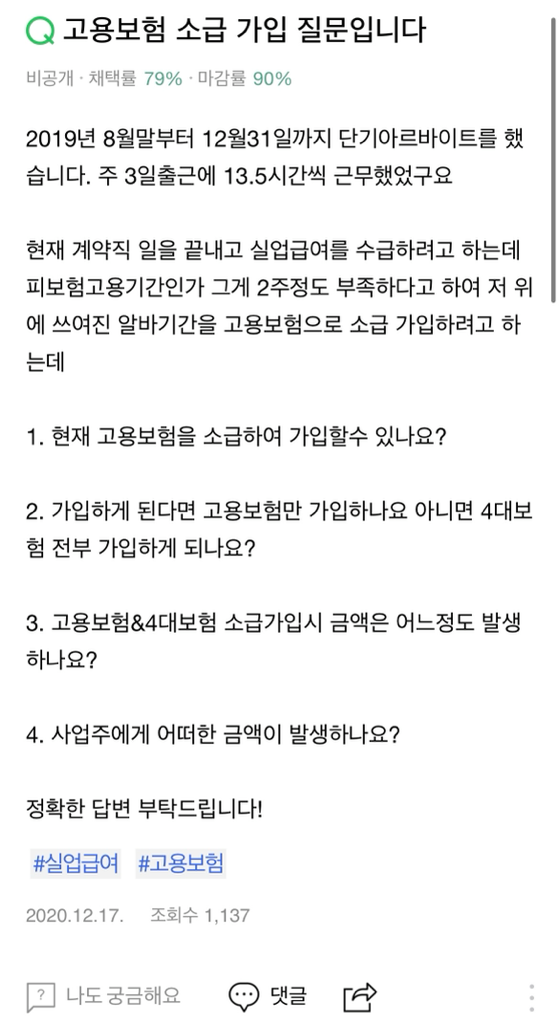 인터넷에 찾아보니 피보험자격을 통해 가입시에는 고용보험만 단독으로 가입이 안되고 4대보험 모두를 가입해야한다는 말도 있고, 고용보험만 된다는 말도 있고.. 뭐가 맞는건지 너무 헷갈리네요