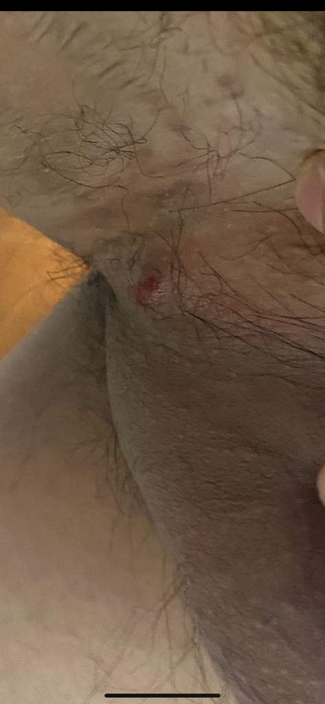 모낭염의 가능성이 있기 때문에 호전이 없다면 피부과 및 비뇨기과에 내원하시어 진료를 받아보시는 것을 추천드립니다.