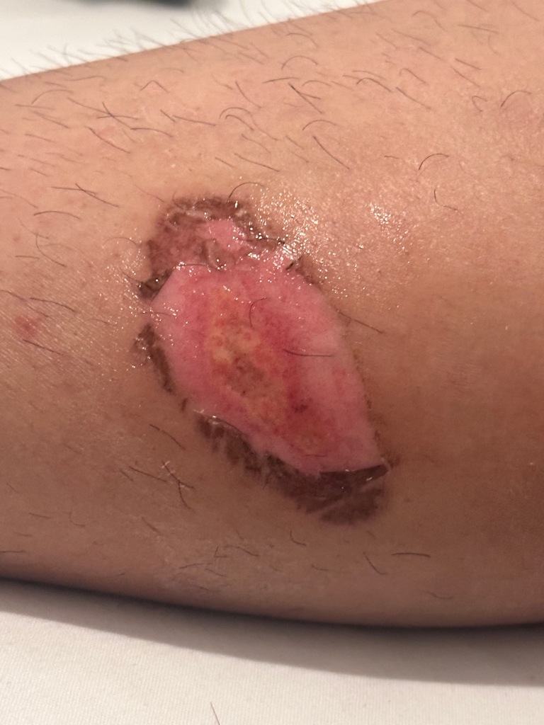 사진 한 장만 가지고 정확하게 상태를 알 수 없습니다만 딱히 문제가 있어 보이는 소견은 아니라고 보입니다. 현재 하고 계신 대로 드레싱을 잘 교체해주면서 관리하다 보면 스스로 호전이 될 가능성이 높아보입니다. 물론 흉터가 남을 가능성은 충분히 있어 보입니다.