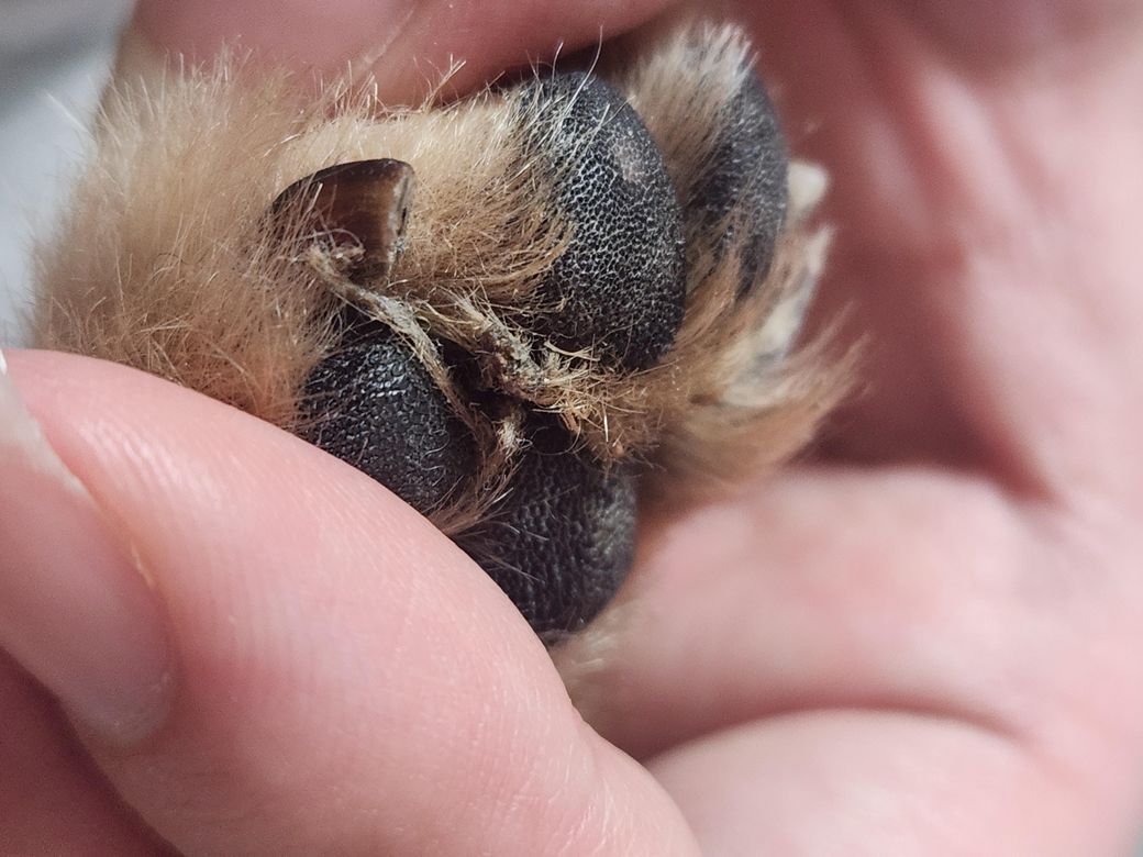 어제 강아지 산으로 산책 다녀오고 목욕 시키고 일어나서 발바닥 보니까 검정색 딱딱하고 찐득한게 붙어있어요 그래서 반려견 미용기기로 밀려고 하는데 딱딱하게 있어서 잘 안되네요ㅠㅠ 이게 뭘가요?