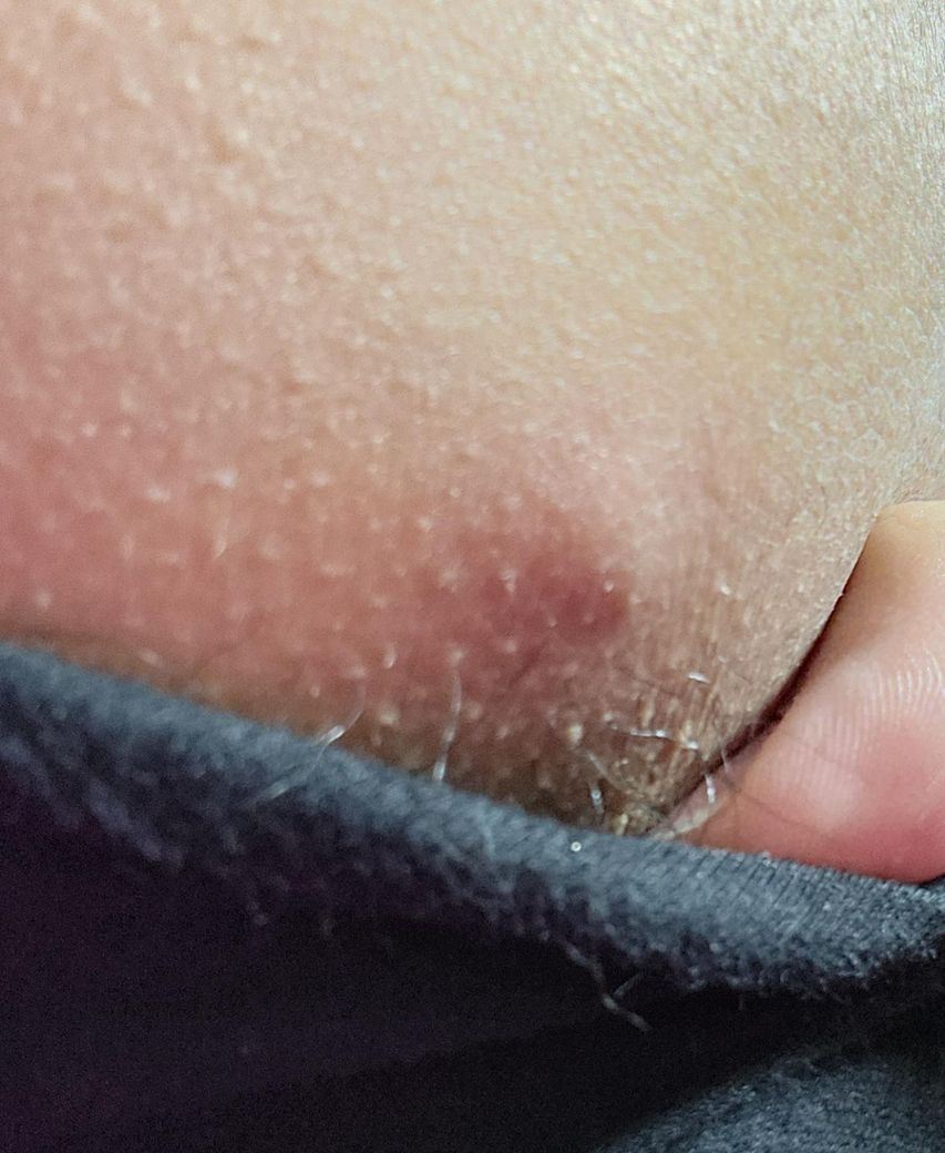 의자에 앉았을 때 엉덩이에 통증이 느껴져서 만져보니 피부 안쪽이 약간 딱딱한 느낌이 들었습니다. 사진을 찍으니 약간 빨갛게도 보입니다. 이런 증상은 뭔가요?