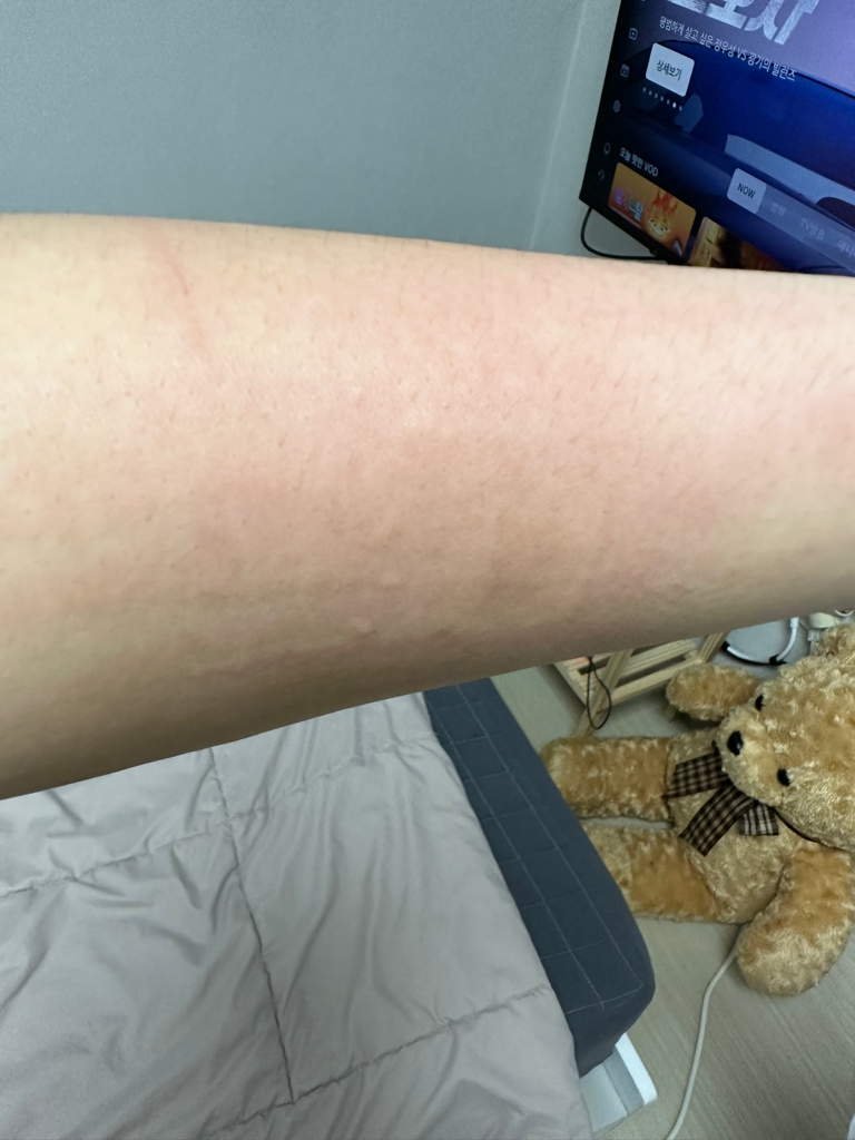사진이 잘 보이지는 않지만 두드러기 증상으로 보입니다. 냉찜질을 하시면서 가려움이 조절되지 않으면 항히스타민제도 추가로 복용해 보시기 바랍니다.