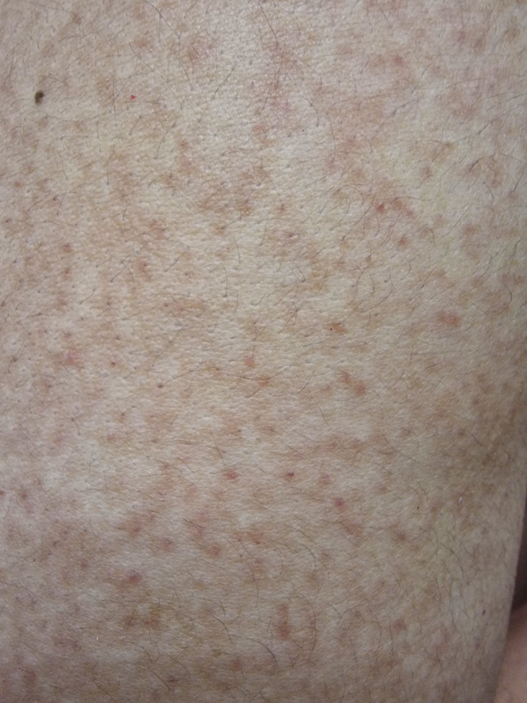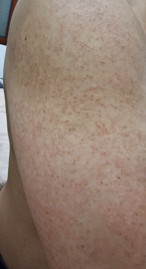 모공각화증으로 보입니다. 모공각화증은 주로 팔과 허벅지, 등, 종아리 등에 발생할 수 있고 모공 입구의 각질과다 증상으로 나타납니다. 케라틴이 과도하게 생성이 되면서 모공이 막혀 피부가 우둘투둘해지는 증상입니다.