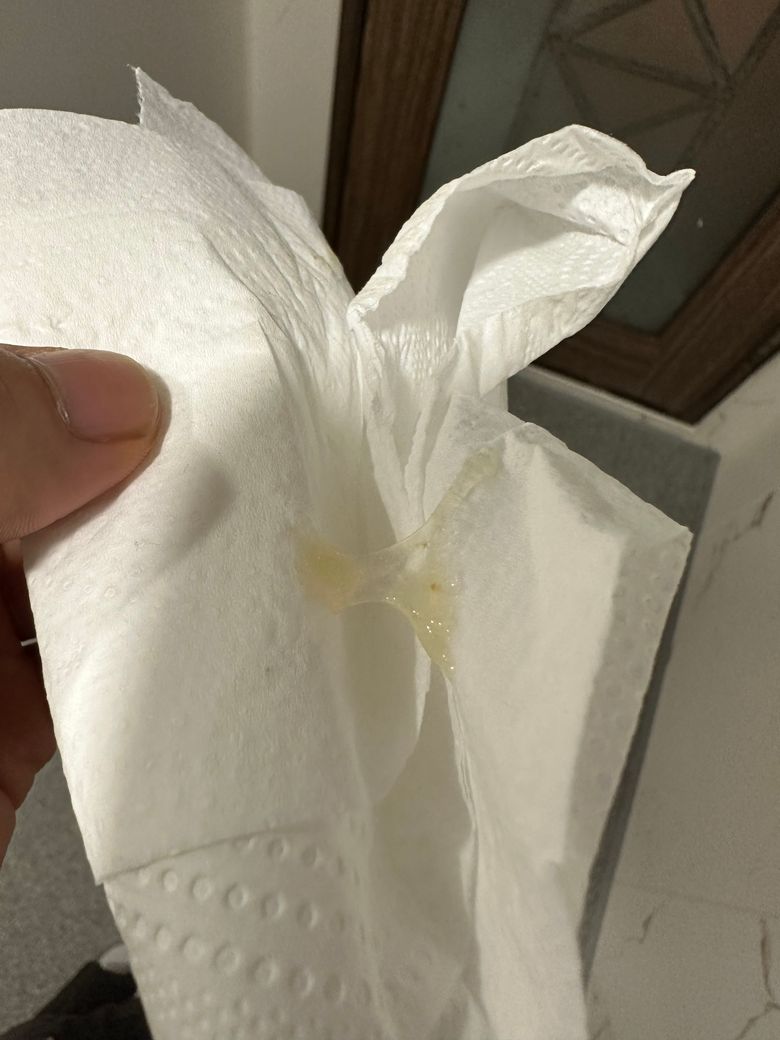 설사을조금했었는데 그후로 조금씩 미끌한게나와서 딱으면 이렇게뭍어나오네요
