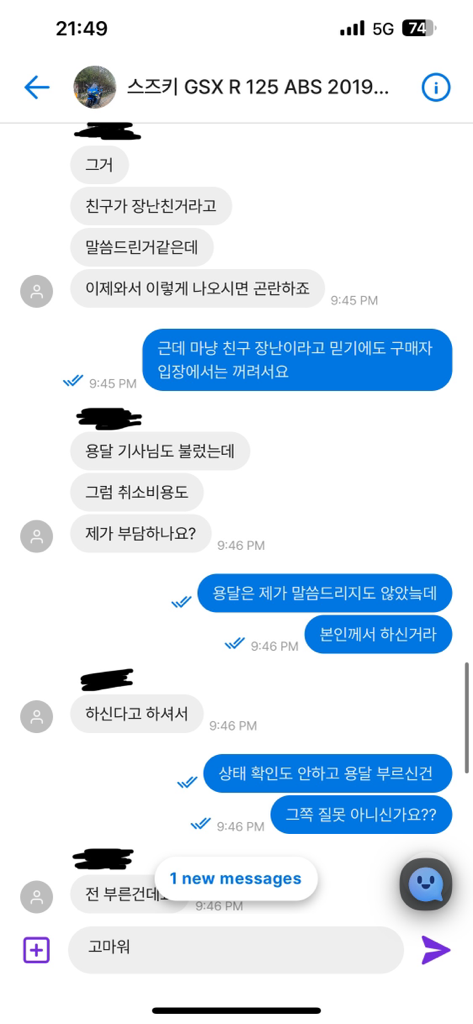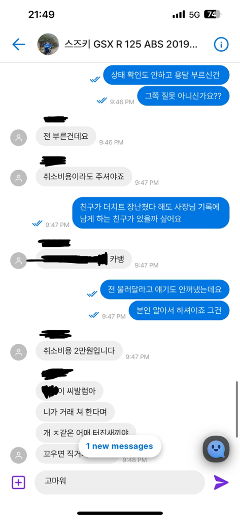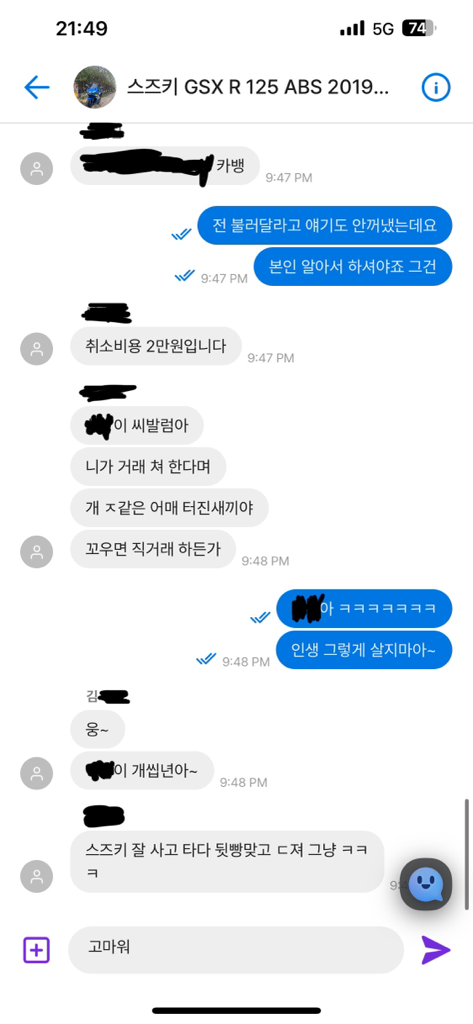 저는 오토바이 상태가 괜찮으면 거래를 하자고 했지만 상대분이 용달을 불러 2만원을 요구하며 계좌를 보냈습니다. 제가 부르지도 않았고 상태보고 구매하겠다고 했기 때문에 상대분 잘못이라 생각하여 왜 제가 부담하냐며 거절을 했습니다. 그 후에 제 이름을 붙이며 욕과 패드립을 했습니다.