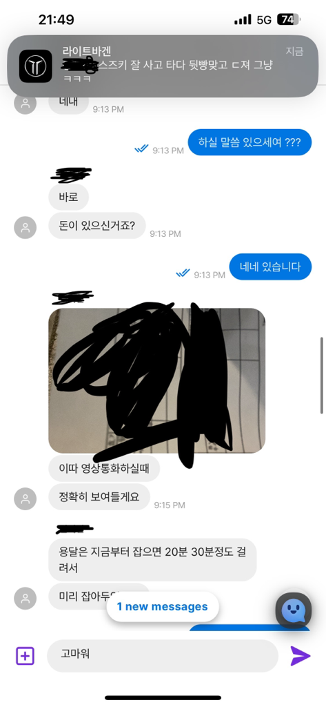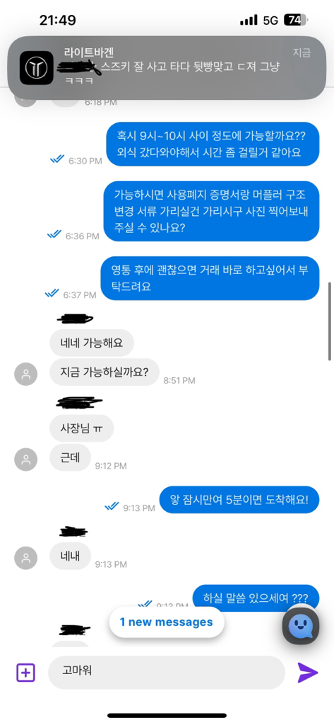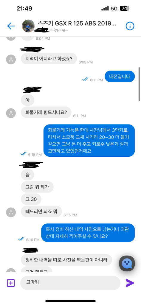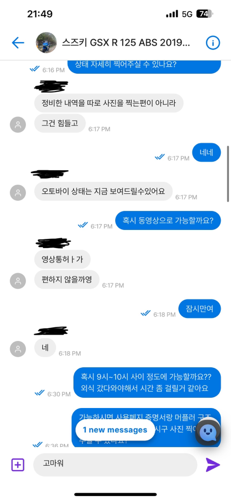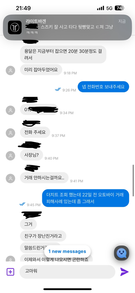 안녕하세요. 오토바이 중고거래 하려고 라이트OO에서 상대분과 채팅으로 얘기했습니다.