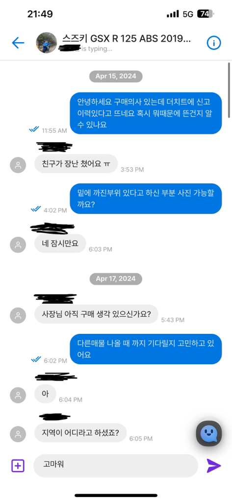 처음에 더치트 사기건이 있다고 떠서 물어봤더니 친구가 썻다고 했습니다. 옛날에 장난친거겠구나 생각하고 영상통화 후 오토바이 상태가 괜찮으면 용달 거래하자고 얘기했습니다. 하지만 전화번호를 받은 뒤 더치트를 조회했을 때 현재 2월 17일 당시로 22일 전 오토바이 거래로 60만원 사기가 떠서 꺼림직 하여 거래를 못하겠다고 했습니다(전화, 영상통화 안하고 거래 못하겠다고 했습니다).