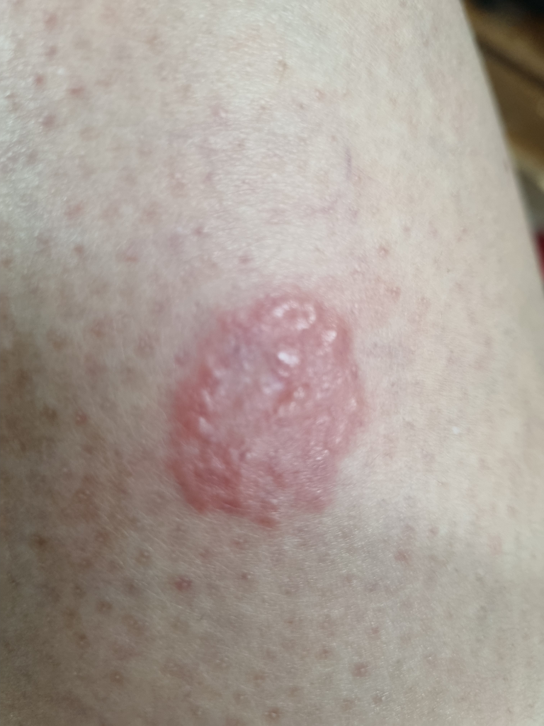 현재 병변은 화폐상 습진을 감별할 필요가 있겠습니다.