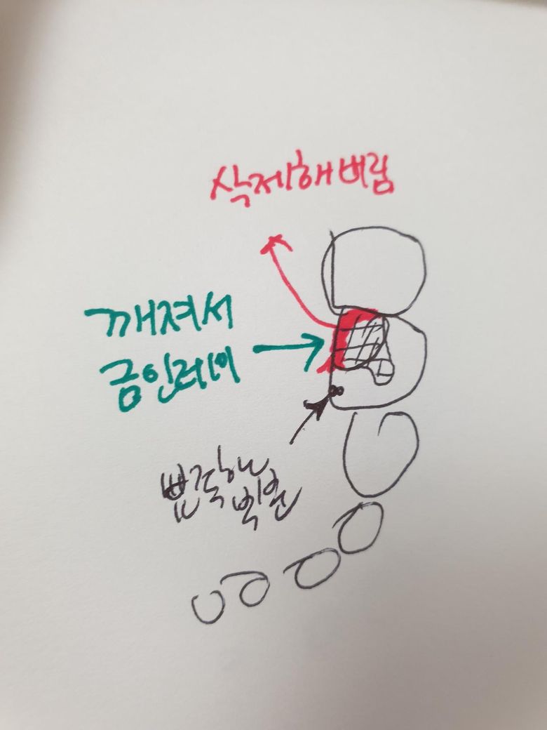그래서 보니 삭제한부분 앞에 뾰족하게 이쑤시게끝처럼 돋아져있어요.