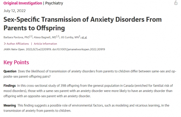 이 연구는 불안장애의 세대 간 전달이 주로 동성 부모로부터 일어난다는 사실을 강조하고 있습니다. 즉, 딸은 어머니, 아들은 아버지로부터 불안장애 진단을 받을 위험이 더 높다는 것을 발견했습니다. 또한 한부모 가정 자녀의 불안장애 발병률이 높았으며, 불안장애가 없는 부모와 함께 살고 있는 자녀의 발병률은 불안장애가 없는 부모와 살지 않는 자녀의 발병률보다 낮았습니다.