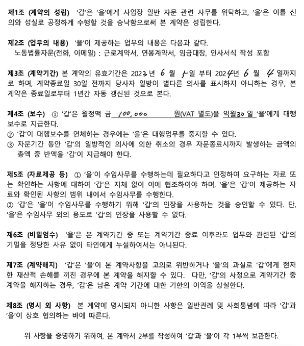 올해 초에 한 직원이 나가면서 여러가지를 질문하고 문제 해결하는 바람에 노무사 사무실 자문 관리 계약을 했는데요