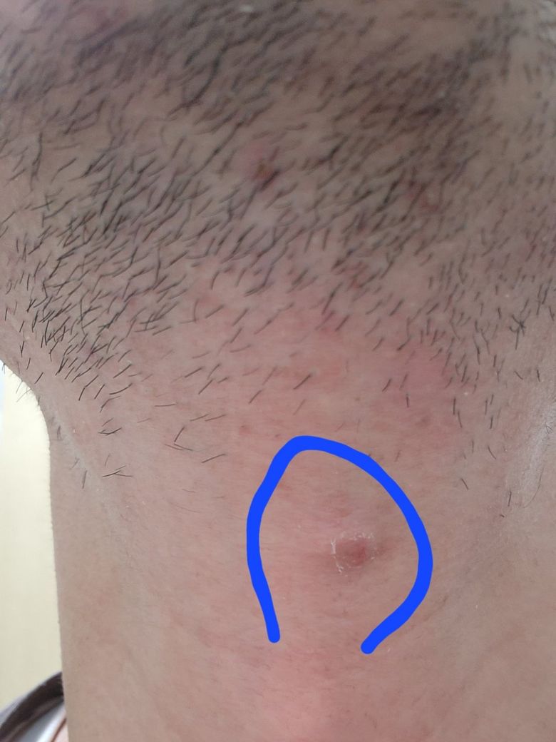 수염으로 인한 모낭염의 가능성이 가장 높겠습니다.