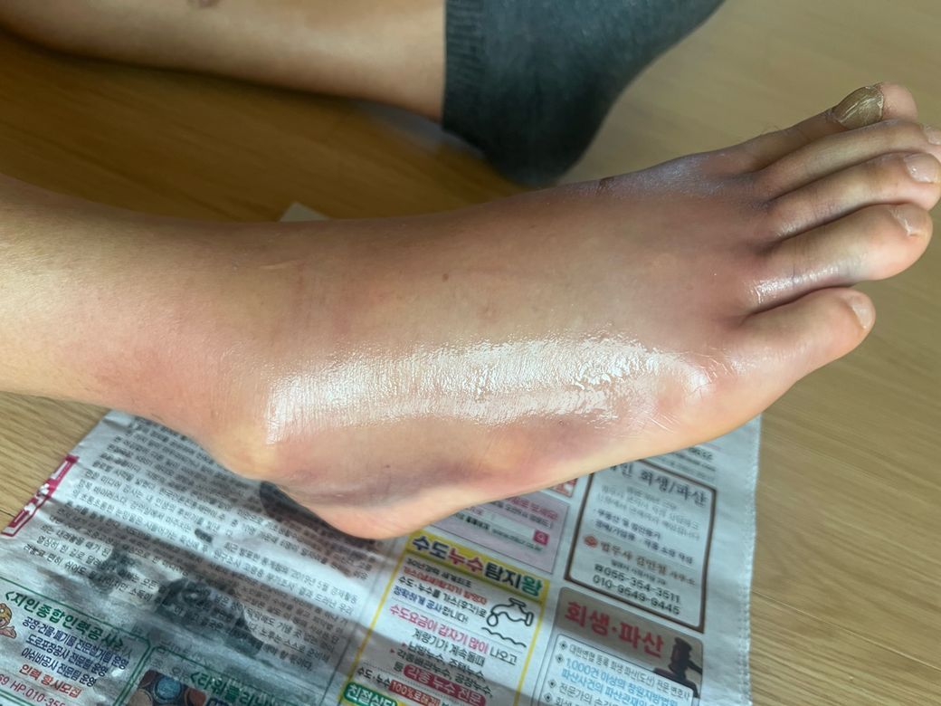산에서 발목을 접질렀는데 주말이라 병원을 안해서 지금 상태가 어떤지 봐주세요. 발을 디딜때 너무 아프다고 하시네요.. 어떤 상태일까요?