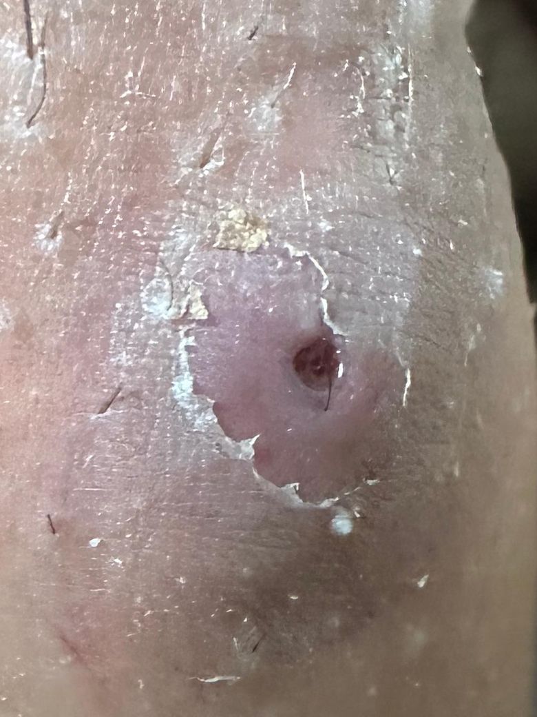 소독하고 에스로반연고 바르고 듀오덤붙이고(2일정도) 떼니 피부가 조금 벗겨지는 부분이 있어 오늘 소독하고 에스로반바르고 멸균 거즈 드레싱 밴드 붙인 상태입니다.