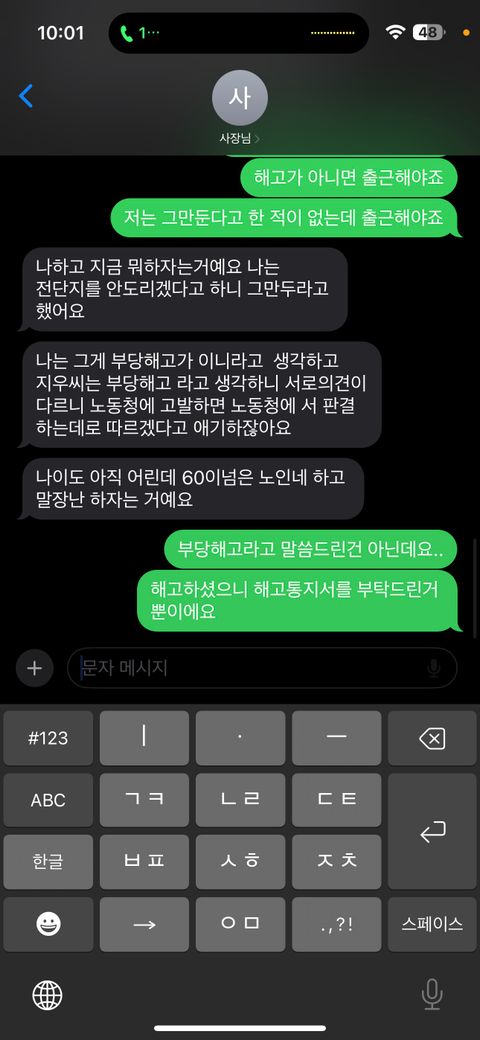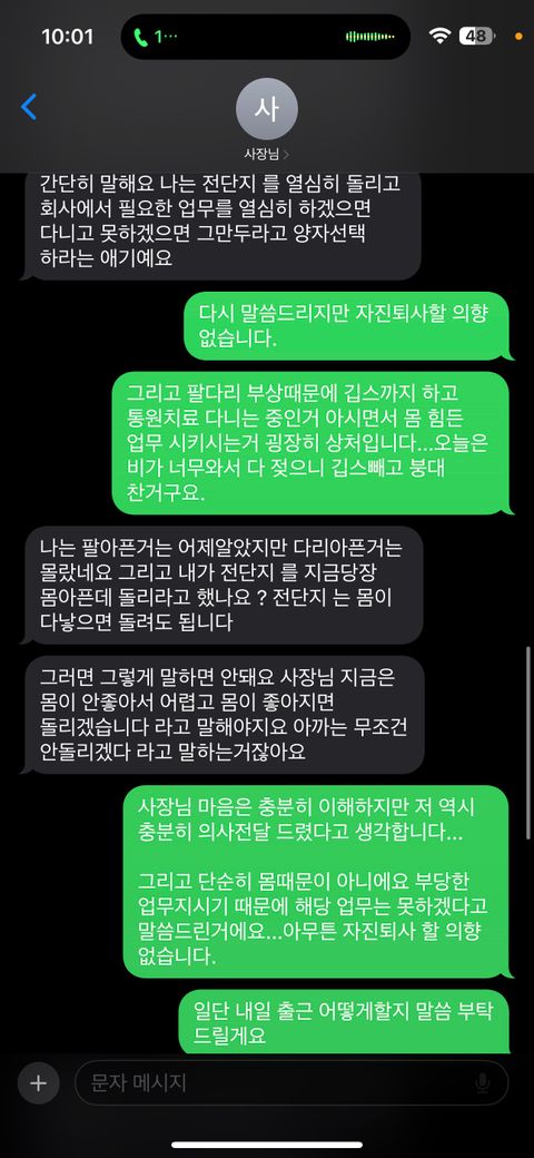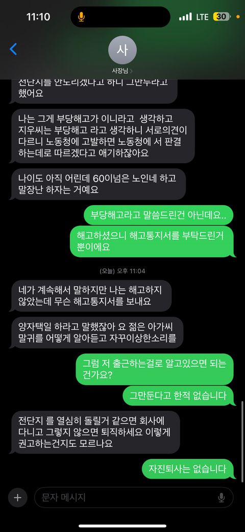 사진과 같이 사장님과 언쟁중인데 중간에 분명 그만두라면서 오늘까지 일한 급여를 지급해주겠다는 내용이 해고통보라고 판단되서 여쭙습니다. 저는 결코 자진퇴사 할 의향이 없습니다만 끝까지 자진퇴사를 강요하듯 압박을 주십니다. 5인미만 사업장이라 방법이 없을듯 하여 불안해요... 저는 3개월 이상 근무했고 전산 사무가 계약서상 업무내용인데 다친 사람한테 부당한 업무지시를 강요해놓고 저러십니다...