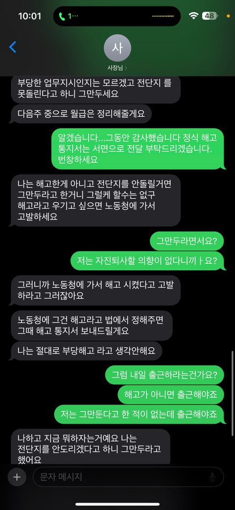 문자로 퇴사종용을 받고있는데 이거 해고통보 맞나요?
