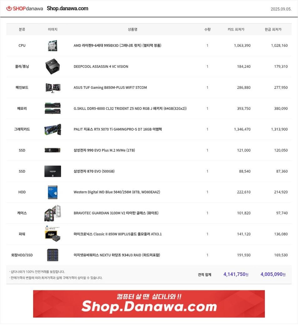 견적 구성 보니까 고성능 작업용에 게이밍까지 충분히 커버할 수 있겠네요. 주요 부품은 라이젠 9 5950X, RTX 3070 그래픽카드, 64GB DDR5 메모리라서 영상 작업이나 무거운 프로그램 돌릴 때도 전혀 부족함 없을 것 같습니다. SSD와 HDD도 모두 실사용에 충분한 수준이고, 파워나 쿨러까지 밸런스 좋게 잡힌 편이네요. 예산이 330~350만 원이라면 램을 32GB로 줄여도 되고 그래픽카드를 4060급으로 조정하면 예산 내에 충분히 맞출 수 있습니다. 개인적으로 작업 비중이 높으니 CPU와 SSD는 그대로 두고, 그래픽카드 조정하면 가성비도 좋아질 거라 생각합니다.