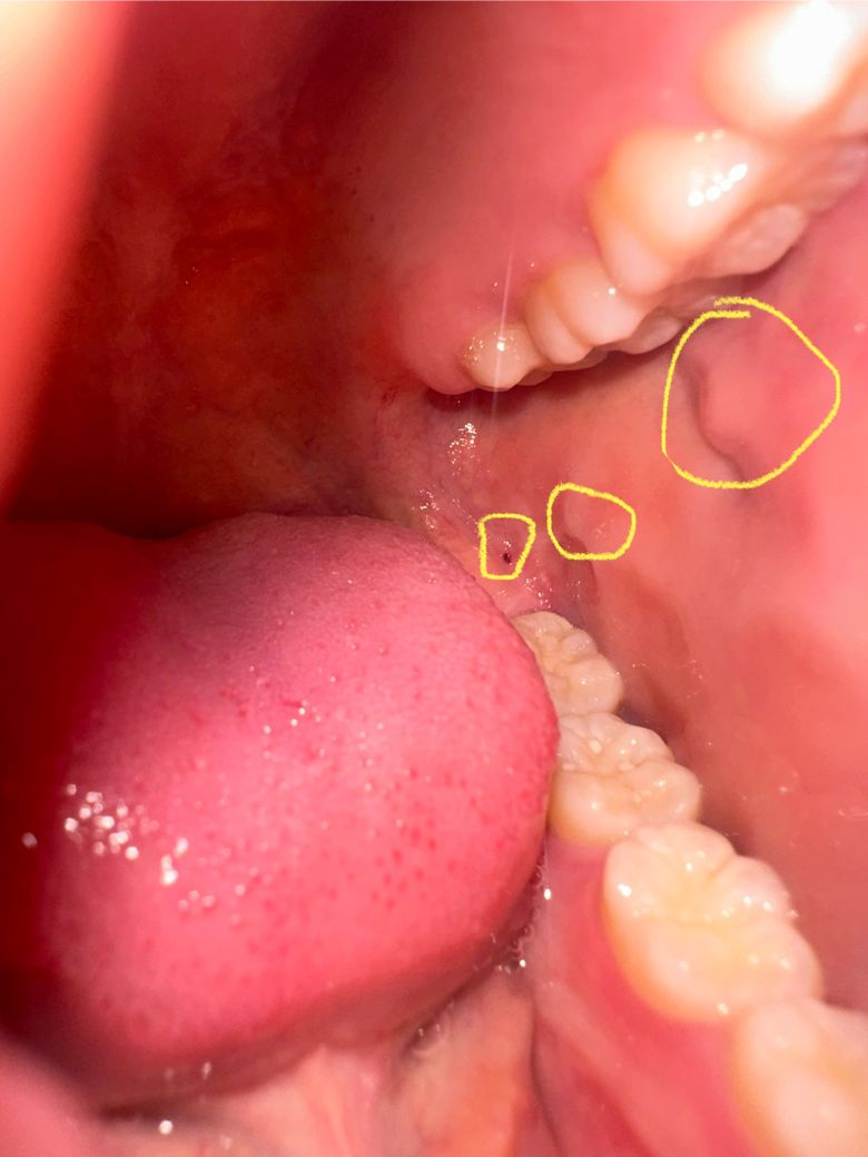 가장 큰 동그라미는 stensen duct로 귀밑샘의 침 분비구이고 중간 동그라미는위아래 어금니가 볼을 씹거나 압력을 가해서 생기는 것입니다. 그리고 마지막 빨간 점도 위쪽 사랑니가 해당 부분을 자극해서 생긴 것으로 셋 모두 전혀 문제 없으므로 걱정하지 않으셔도 되겠습니다.