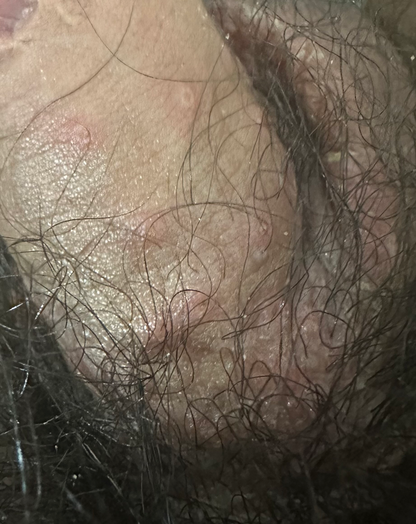 첨부해주신 사진을 보았을때 헤르페스 포진을 포함한 급성 성병이 의심됩니다.