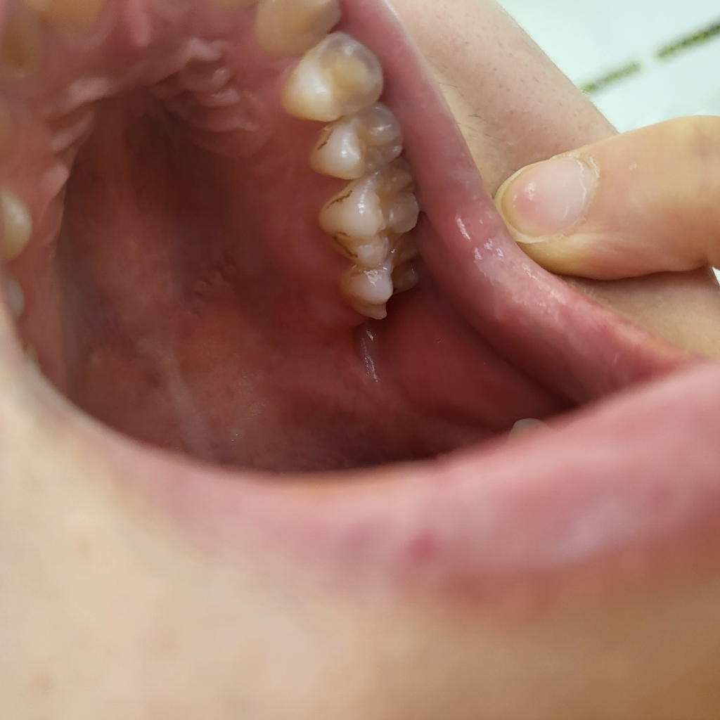 사진상에서는 충치보다는 단순 착색으로 보입니다. 증상이 있으면 치과에 내원하여 검사해보시는게 좋겠습니다.
