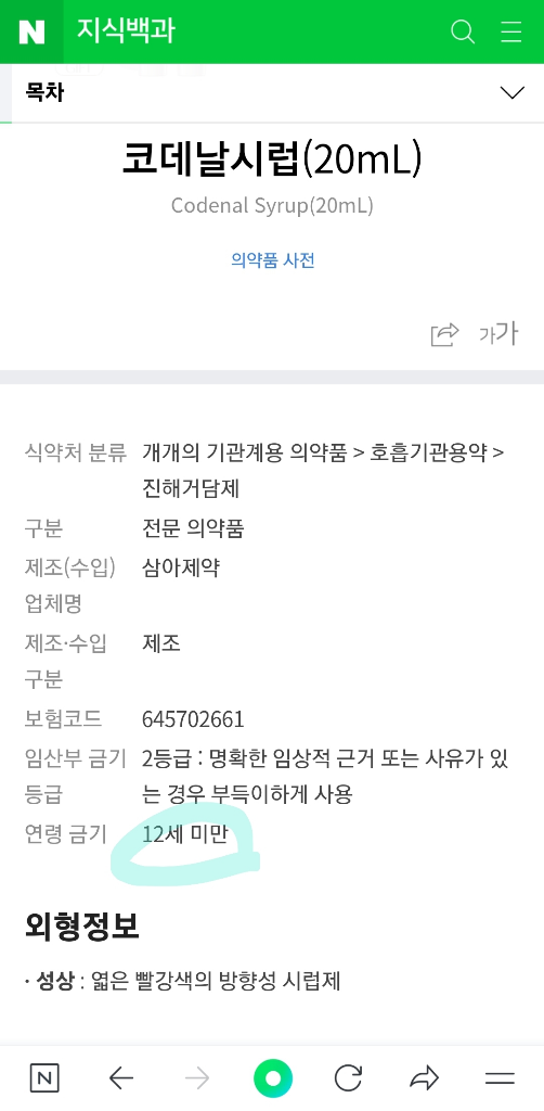 코데날시럽은 만 12세 이하는 안전하지 않아서 먹이지마세요.