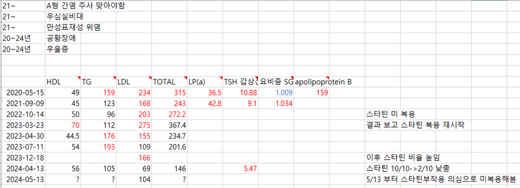 혹시 보시면서 참고하시면 좋을 것 같아 건강 검진·피검사 헀을 때 의심된 부분을 체크해서 엑셀로 정리해보았습니다.