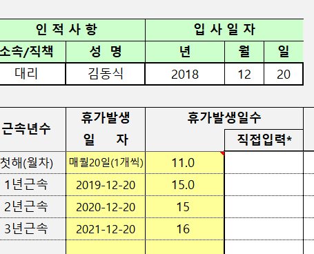 2018. 12. 20. 입사한 근로자의 입사일 기준 연차휴가는 아래와 같습니다.