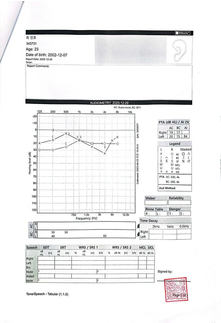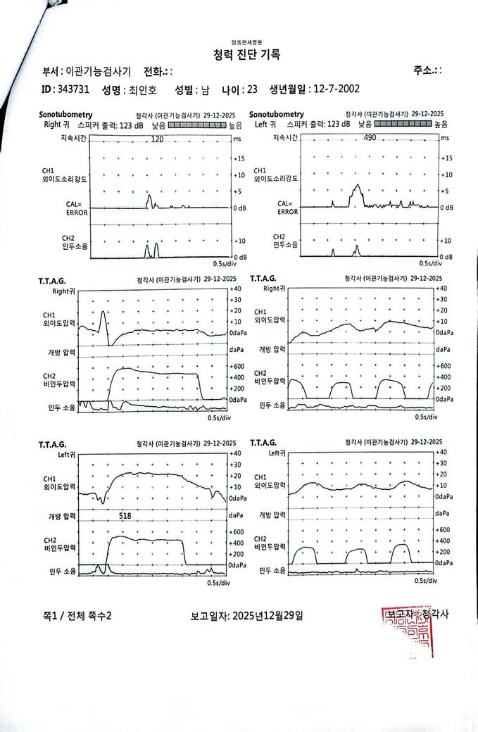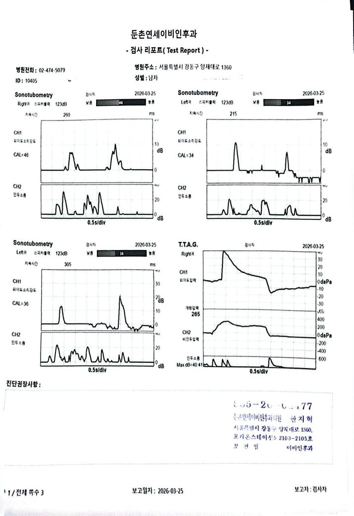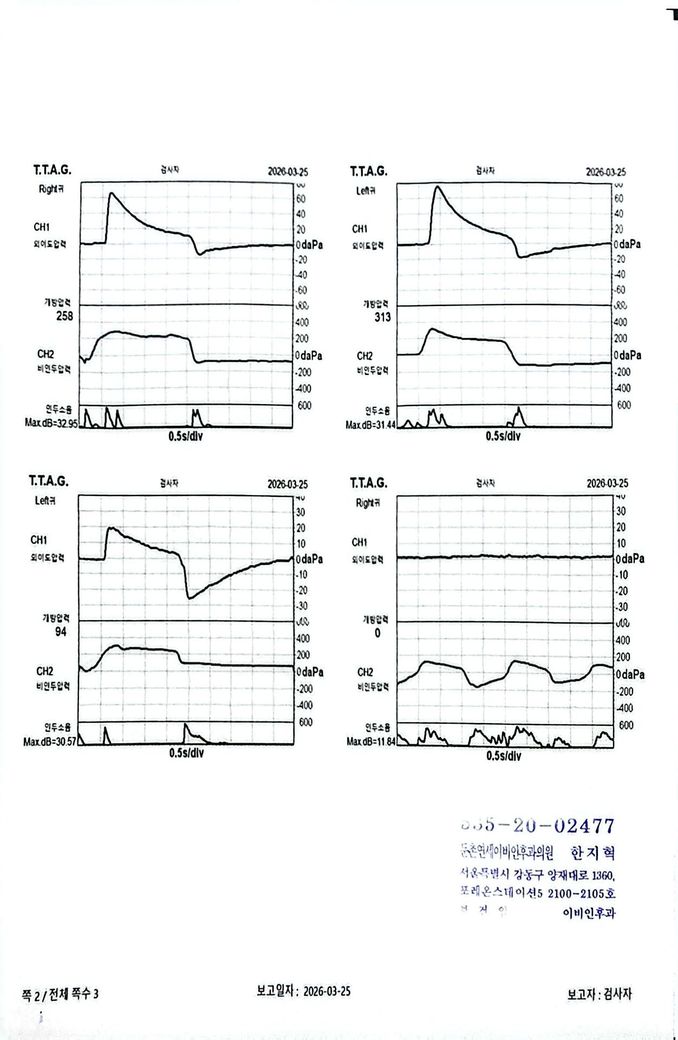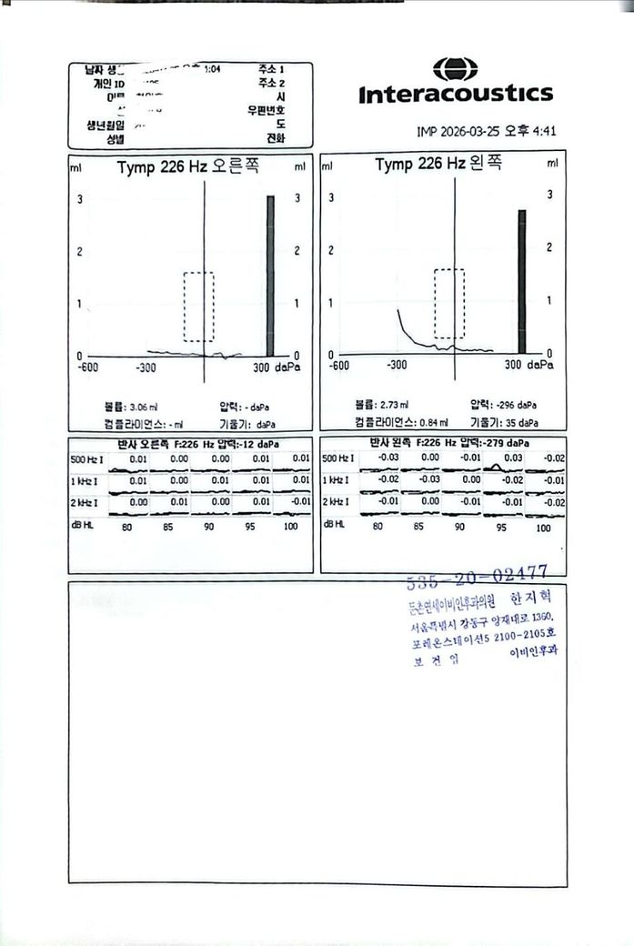 현재 검사 결과를 종합하면, 순음청력검사에서는 경도 전도성 난청 수준은 아니고 비교적 유지되어 있습니다. 그러나 고막 운동성을 보는 검사에서는 음압이 크게 음성 방향으로 이동되어 있고, compliance가 떨어진 패턴이 보여 기능적으로는 이관 폐쇄 쪽, 즉 환기 불량 상태에 더 가깝습니다. “이관 개방”으로 보는 근거는 상대적으로 약합니다. 개방성 이관이면 보통 자가호흡 시 고막 움직임이 과도하게 보이거나, 자가음 증상이 뚜렷해야 하는데 현재 증상은 오히려 반대입니다.