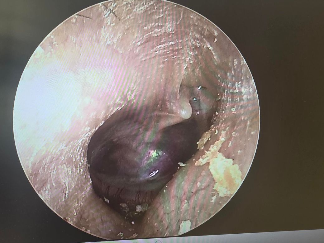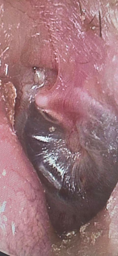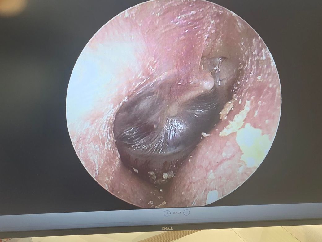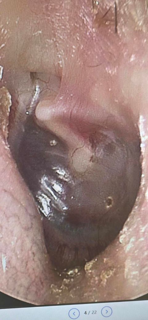 제시하신 고막 사진은 전반적으로 심한 함몰(retraction)과 일부 부위의 유착(adhesion)이 의심되는 소견입니다. 특히 고막이 중이 쪽으로 깊게 당겨져 있고, 광택이 줄어들며 특정 부위가 고정된 형태로 보입니다. 이는 단순한 일시적 음압 상태를 넘어서, 만성적인 이관 기능 이상에 의해 구조 변화가 진행된 단계로 해석하는 것이 타당합니다.
