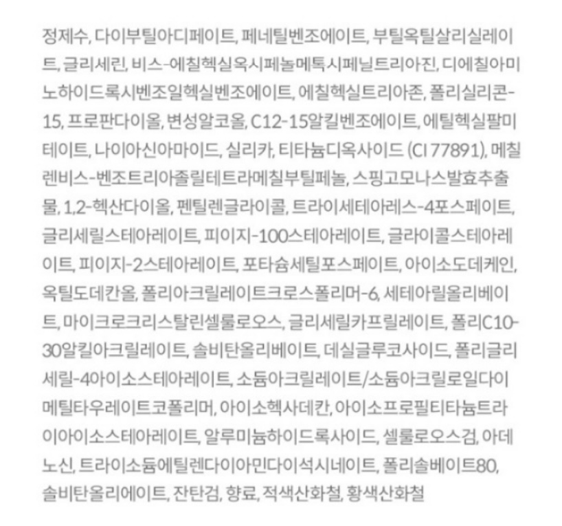 예전에 사용했던 유기자차 선크림은 괜찮았는데, 최근에 새로운 선크림 사용할 때마다 이런 증상이 있어서 무엇이 원인인지 궁금합니다..! 첫번째는 유기자차 선크림 전성분표이고, 두번째는 혼합자차 선크림 전성분표입니다. 화장품 성분, 알레르기에 대해 박식한 선생님들께 도움 요청합니다 😣