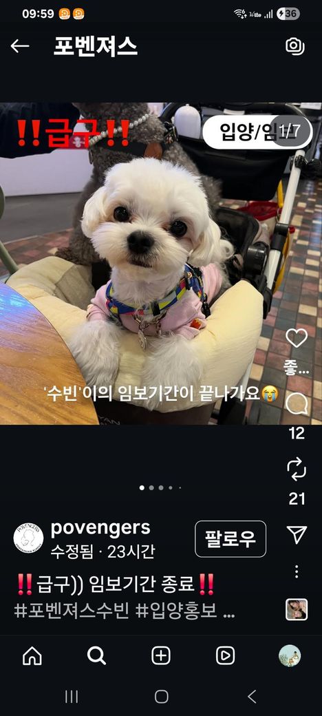 그래서 임시보호를 하고 있는 상태이고, 다음 임시보호자 또는 입양자를 구하려고 글을 게시한것으로 보여집니다.
